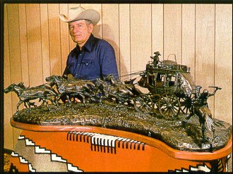 His wife, Fay, was always a constant inspiration to his work. After their marriage, in 1939, Bill served in the Navy, and was put in charge of occupational therapy using leather crafts. After the war he returned to Seymour, Texas, where he owned and operated a saddle and boot shop until 1953. It was during this time one of his most outstanding works was done, a life-size leather carving of Will Rogers, which was shown in the Cowboy Hall of Fame in Oklahoma City for several years. It is now in the Will Rogers Memorial Museum in Claremore, Oklahoma. His leather carving and artistic skills were given special recognition when he was commissioned to make the first saddle for the World Champion Rodeo Cowgirl in 1951.
